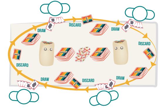 브리또 한쌍을 테이블 위에 놓고 모든 사람이 브리또에 빠르게 갈 수 있는지를 확인하고 카드를 섞습니다. 모든 플레이어들은 15장의 카드를 받고 나머지 카드를 두 곳에 나누어 놓습니다. 각 플레이어들은 카드 5장을 항상 손에 들고 있어야 하고 받은 15장의 카드를 다 사용하게 되면 가운데 놓인 카드를 가지고 옵니다.