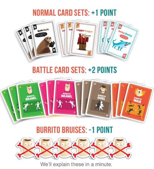브리토 전쟁: 3장의 매치된 War 카드는 테이블에 있는 모든 플레이어(브리토 카드를 플레이한 플레이어 제외)가 부리토를 향해 손을 뻗고 다른 플레이어에게 던지도록 한다. 브리또로 가장 먼저 맞은 선수는 실점한다.