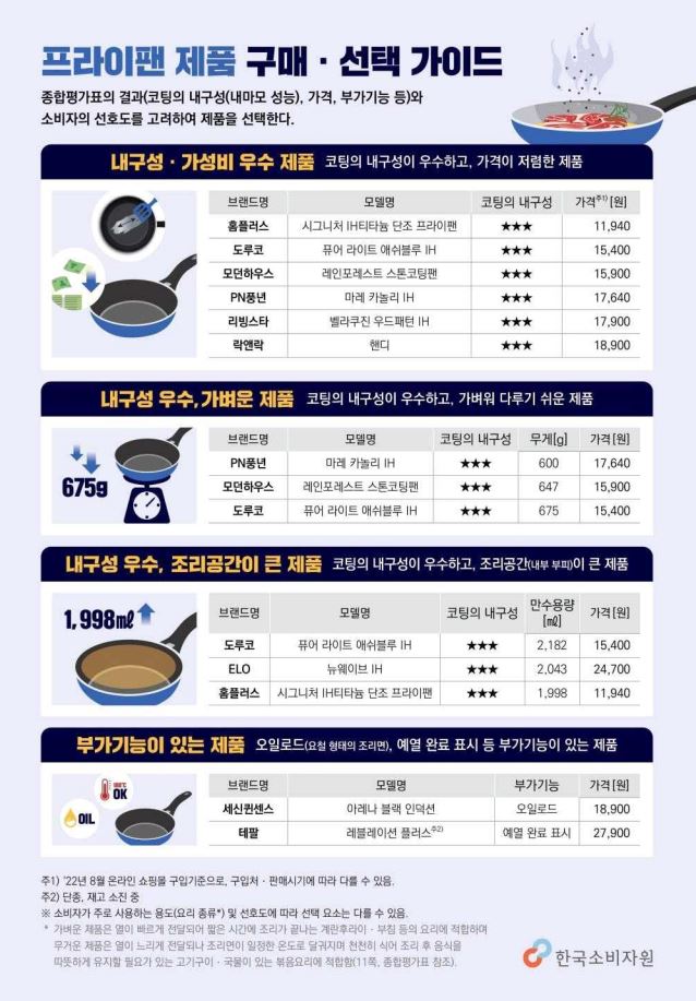 최근 한국소비자원이 시중에 유통되는 프라이팬의 코팅된 부분을 철 수세미로 3,000번 긁어 실험한 후 가성비가 좋은 프라이팬을 소개했다.