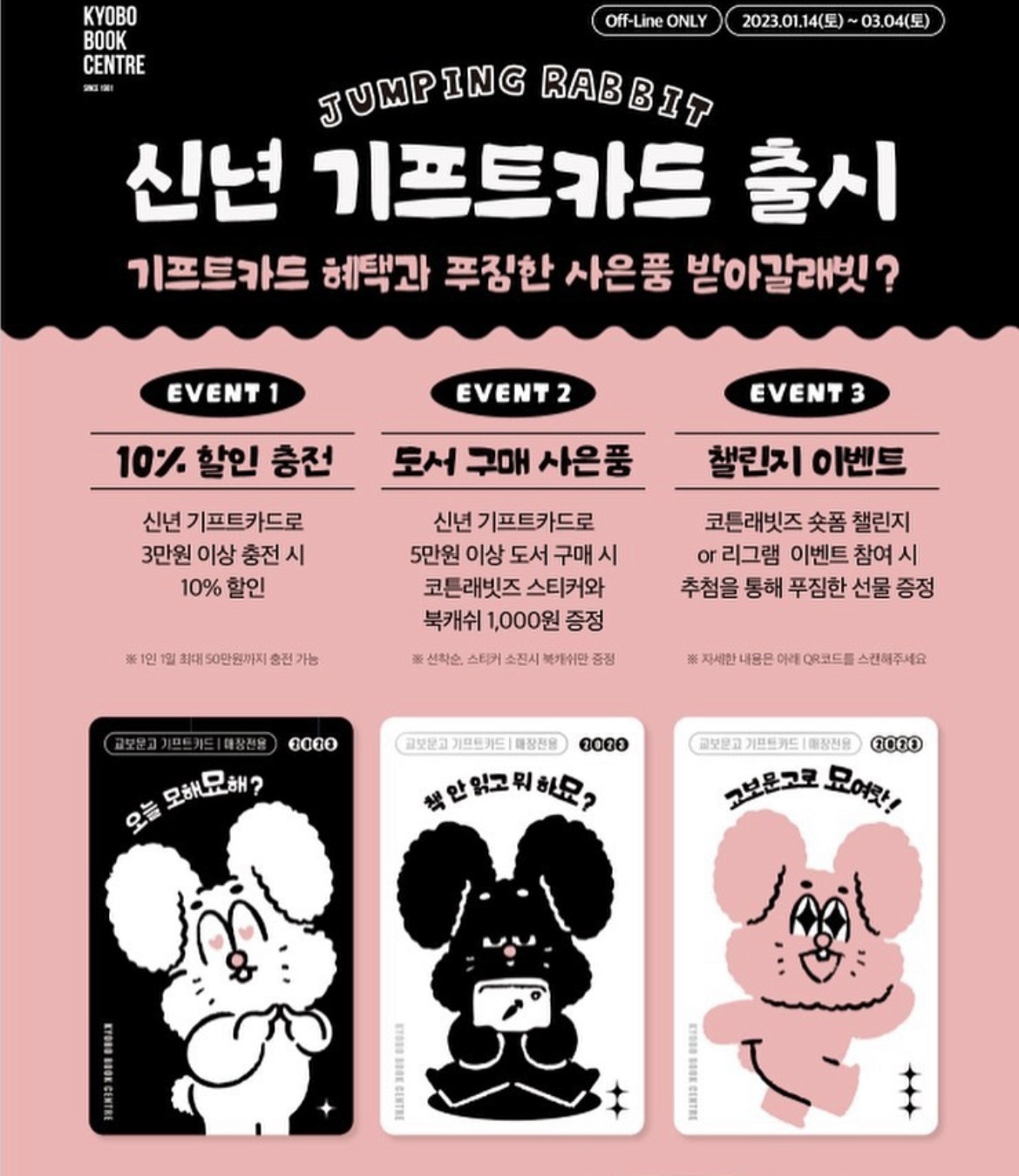 작년 아이들 초등학교 입학 선물로 교보문고 기프티 카드를 선물 받았었는데 의외로 아이들이 사고 싶은 책도 구매하고 아기자기한 문구들까지 구매하면서 너무 즐거워하는 아이들 보며 이런 선물도 괜찮겠다 생각했었다. 그래서 올해 초등학교 입학을 앞둔 지인들 아이에게 선물할 기프트 카드를 구매하러 교보문고에 갔다. 2023년 계묘년 새해맞이 기프트 카드가 출시되어 할인등 이벤트를 하고 더 좋은 선물이 될 것 같다. 아기 자기한 코튼 래빗즈 그림의 카드는 기존 기프트 카드와는 달리 매장전용 카드라 오프라인 사용만 가능하다.